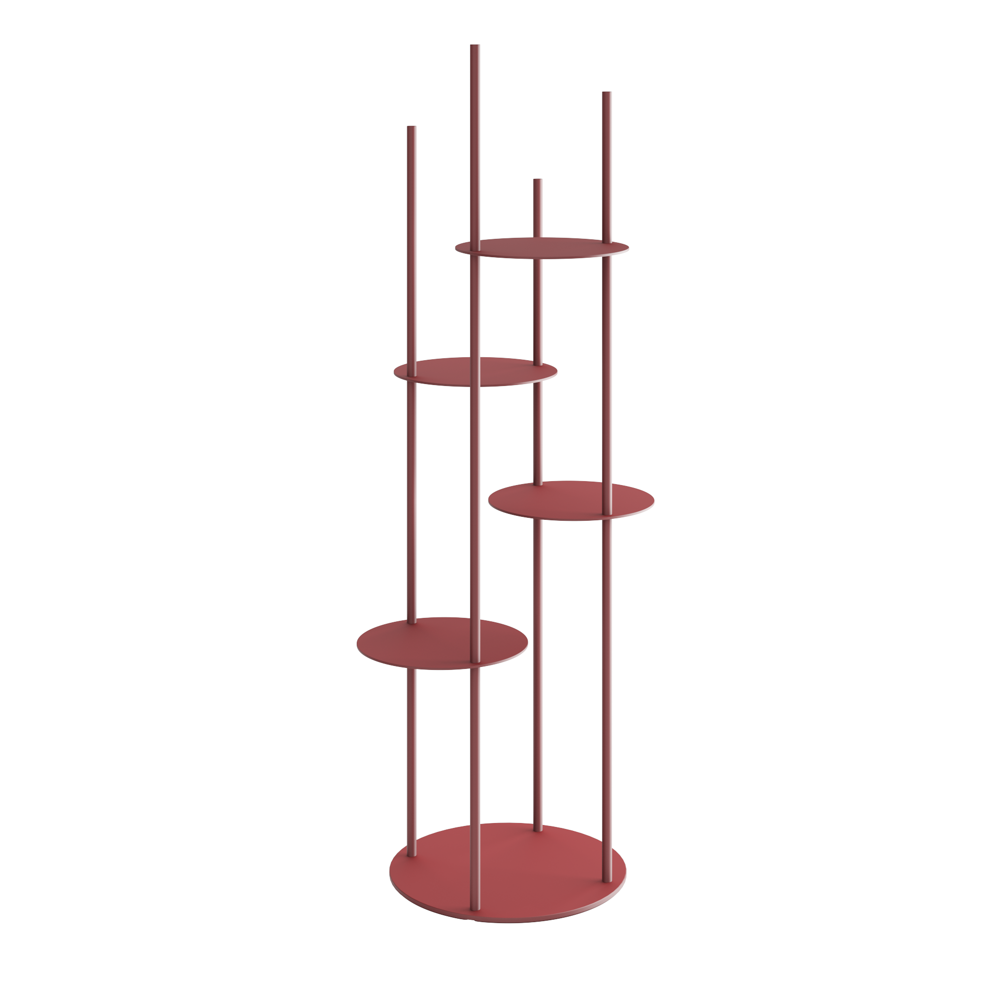 Totem for holding objects in a circular shape on several levels. Made entirely from varnished metal.